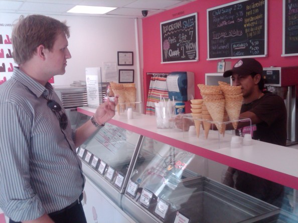 On a warm afternoon while waltzing through the northern Alphabet we stopped into a new looking ice cream shop. The decor was mediocre and the icre cream turned out to be on the low end of par. However, what makes me think about this place and why it was worth a yelp review was the young man behind the counter – Roberto.