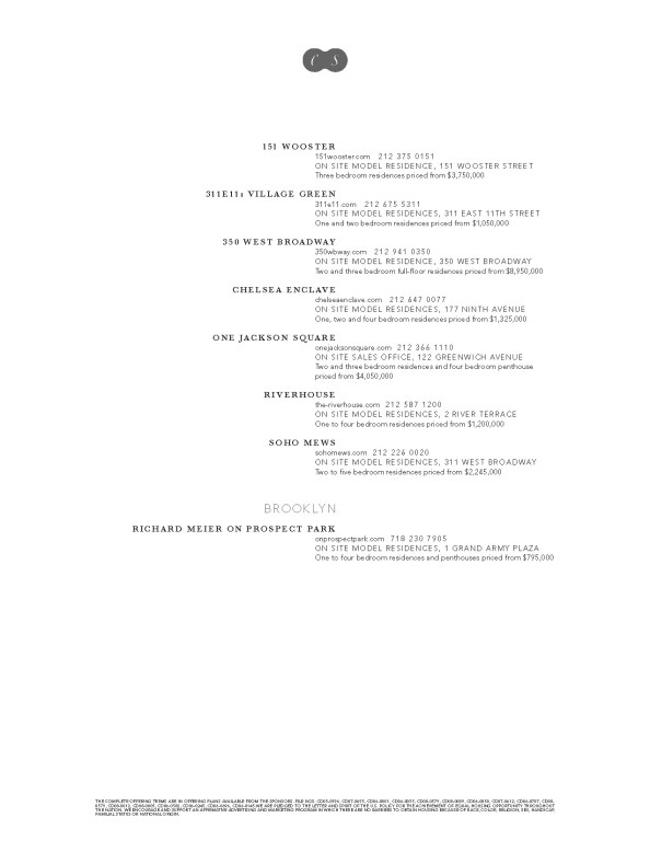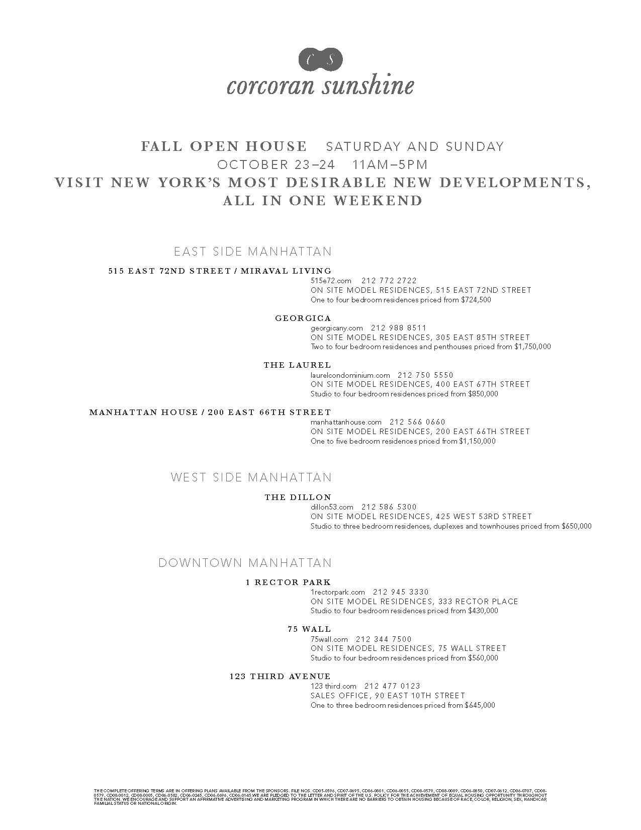 A few times a year Corcoran’s new development arm Corcoran Sunshine holds a large Open House at all of their properties. This weekend on the 23rd and 24th from 11am-5pm all of the properties will be staffed. There are 4 on the Upper East Side, 1 in Midtown West, 3 in the Financial District, 2 in the East Village (including the Blumstein Team exclusive 311 East 11th), 3 in SoHo (including the Blumstein Team’s 151 Wooster), and 1 in Chelsea and West Village each.