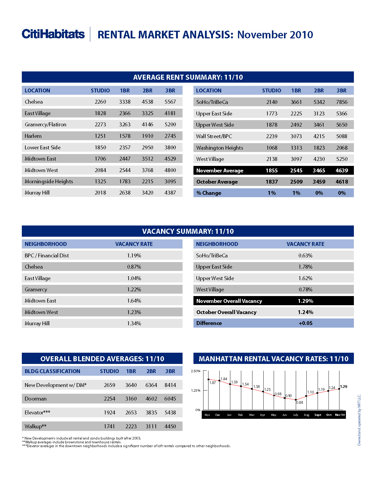 – Overall rents were flat for 2 or more bedrooms, but studios and 1 bedroom units actually gained a point. Market-wide, 1BR units went for $2,545, with SoHo/Tribeca tipping the scales at $3,661 and Washington Heights the lightweight at $1,313.