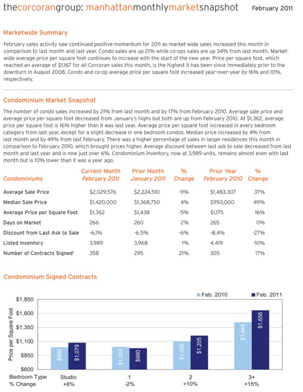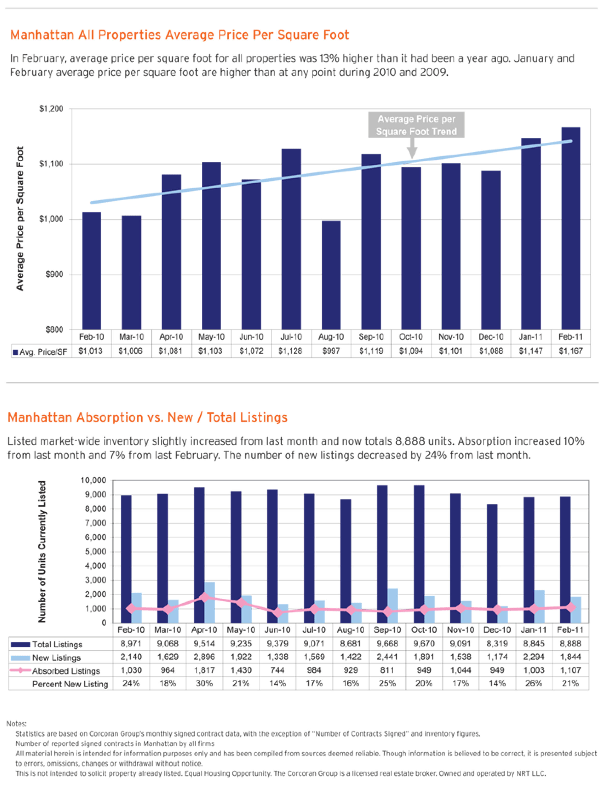 Even though February is the runt of months, it managed enough oomph to pour paint all over the illustrious ‘1st month of the year’. Co-op sales were up 34% over January 2011, and condos saw a 21% rise. Compared to a year ago February, the jump is 5% and 17% respectively. Price per square foot has gone up 10% and 16% respectively as well, with co-ops commanding $1008/sqft, and condos getting $1,362. Not a bad return if you purchased last year – on top of your $8000 home buying credit!